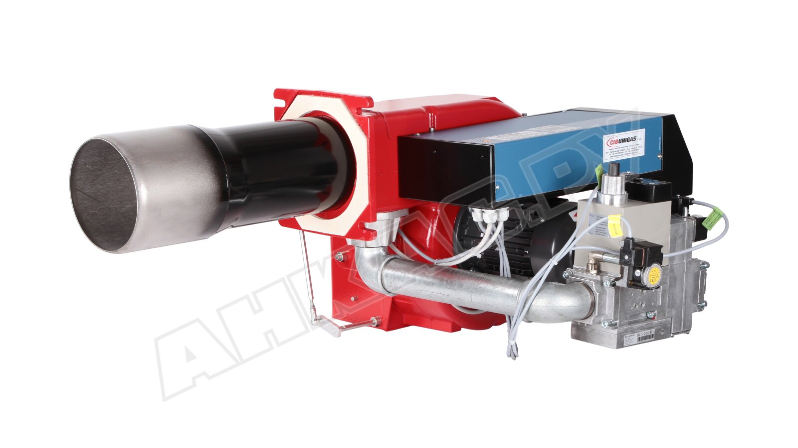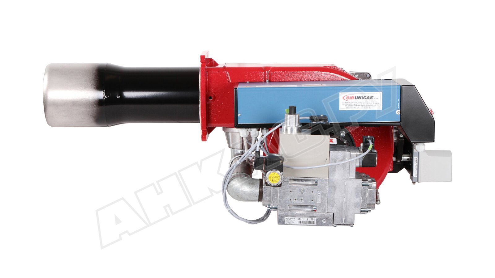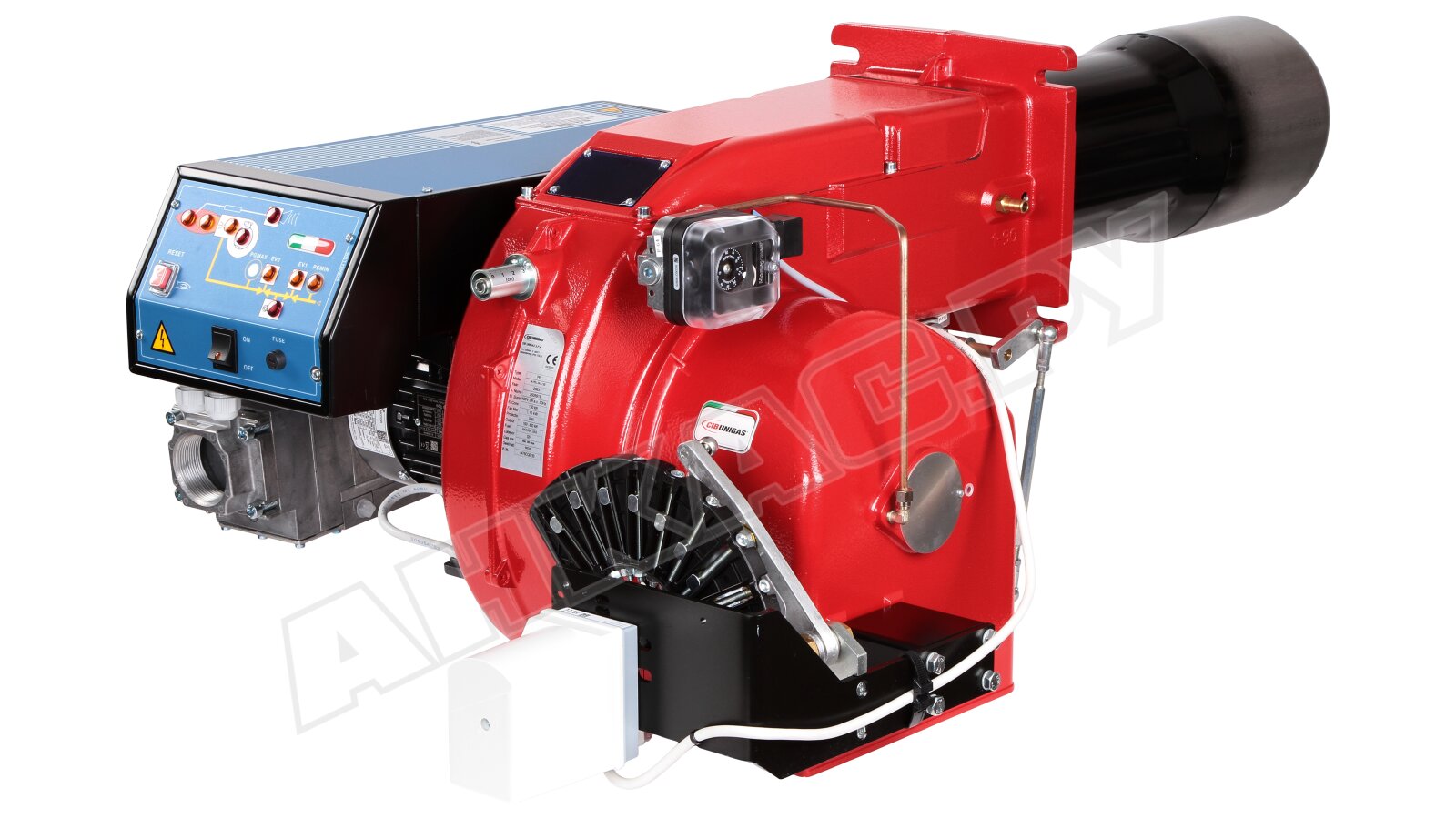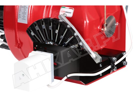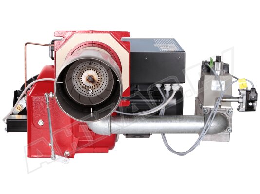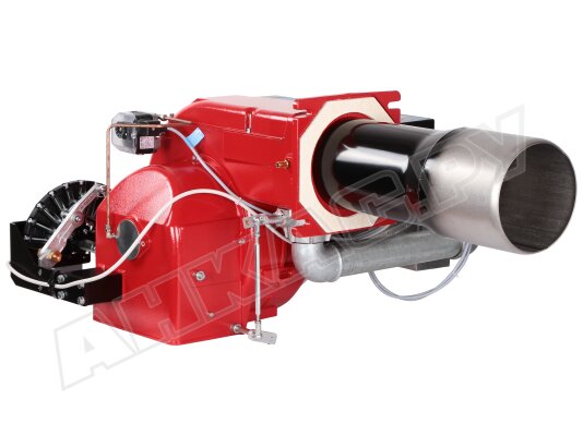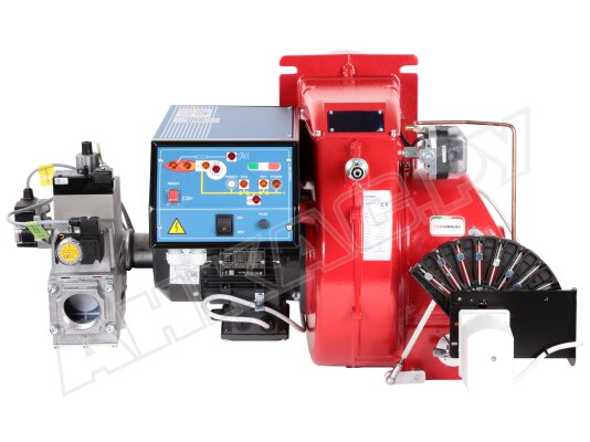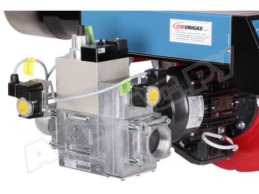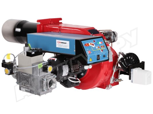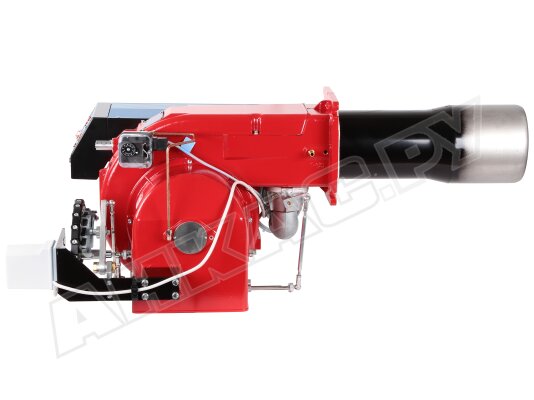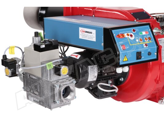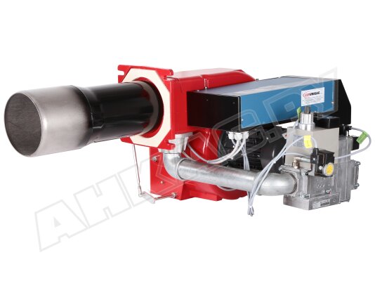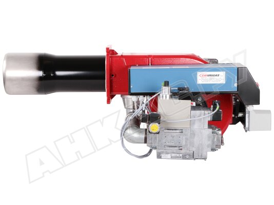 Модификация газовой горелки CIB Unigas, работающей на природном газе (метан), с прогрессивным регулированием, длинным соплом, с двумя клапанами и реле максимального давления газа. Поставляется в стандартном исполнении, диаметр газовой рампы Rp 2".