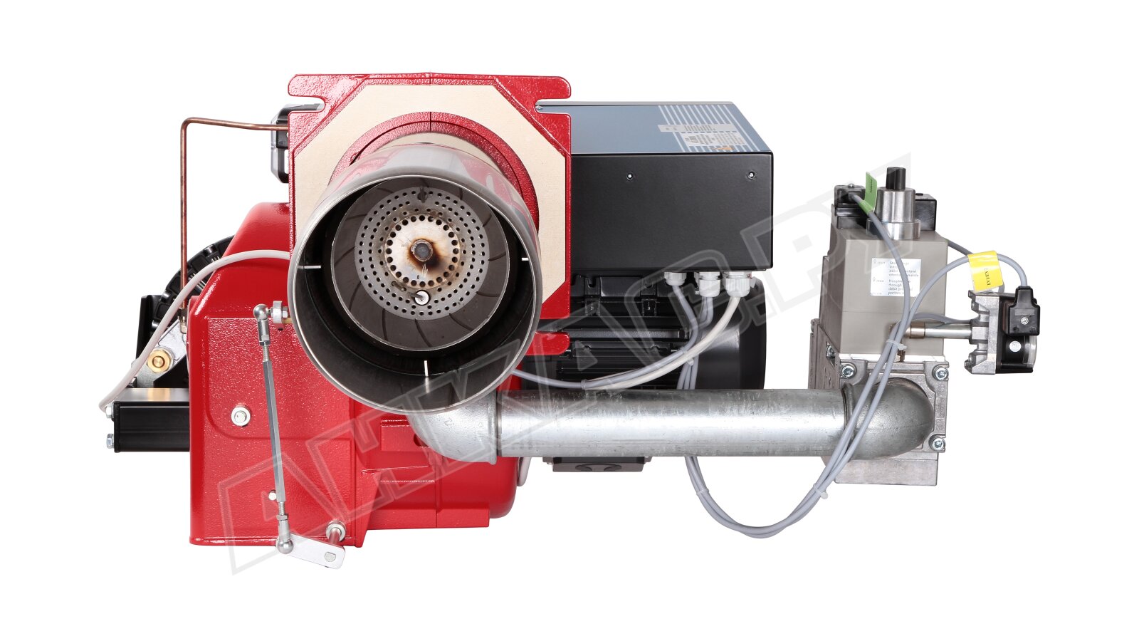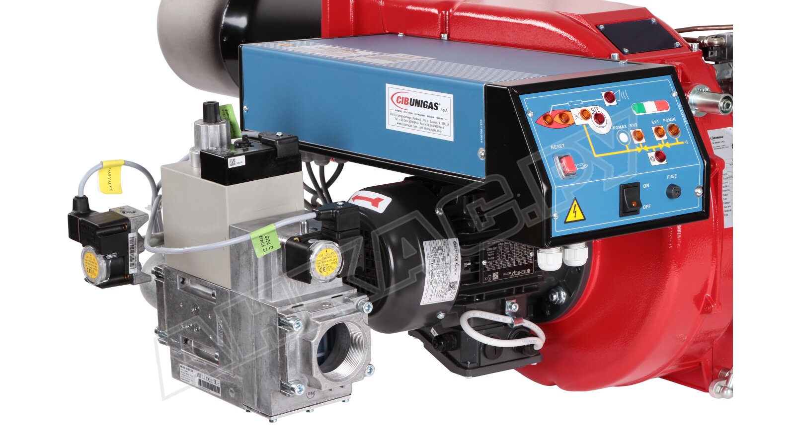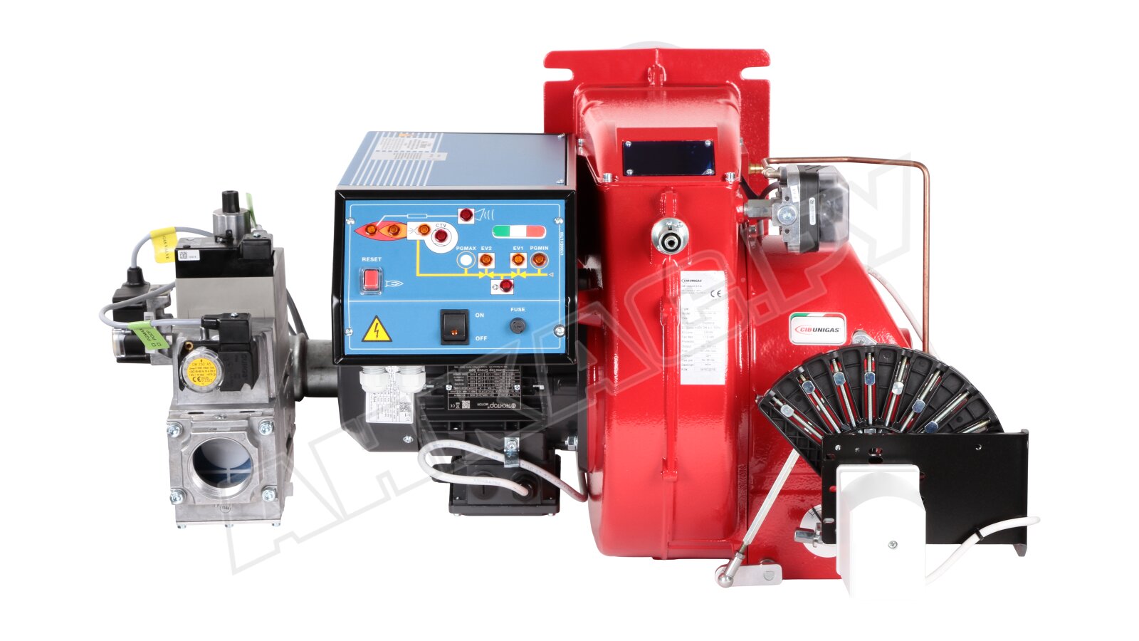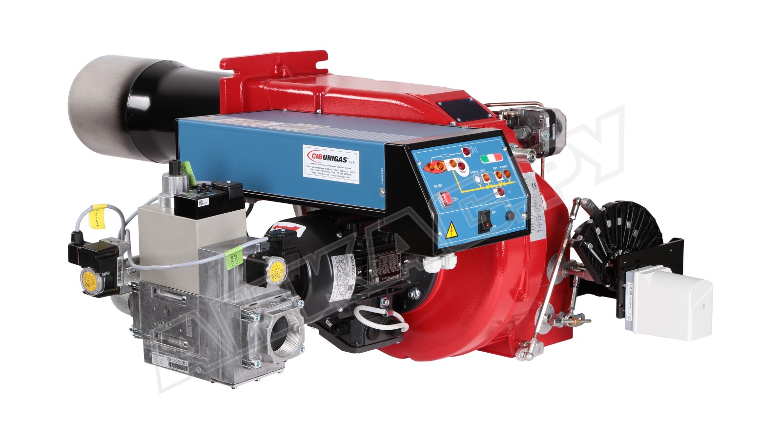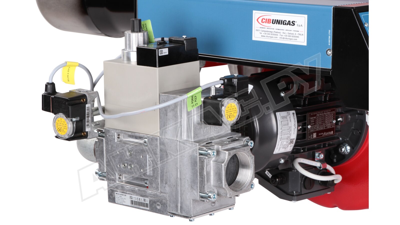 Модификация газовой горелки CIB Unigas, работающей на природном газе (метан), с прогрессивным регулированием, длинным соплом, с двумя клапанами и реле максимального давления газа. Поставляется в стандартном исполнении, диаметр газовой рампы Rp 2".