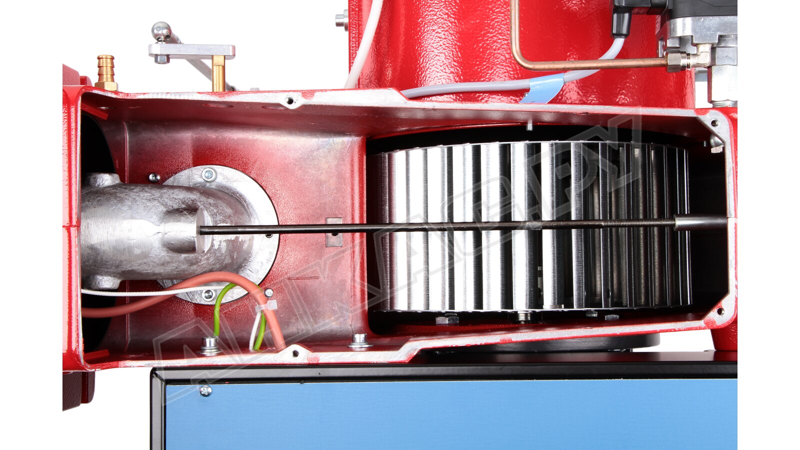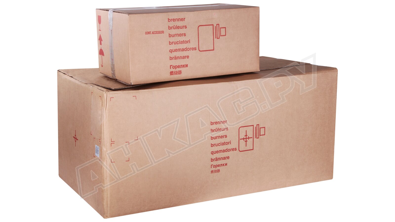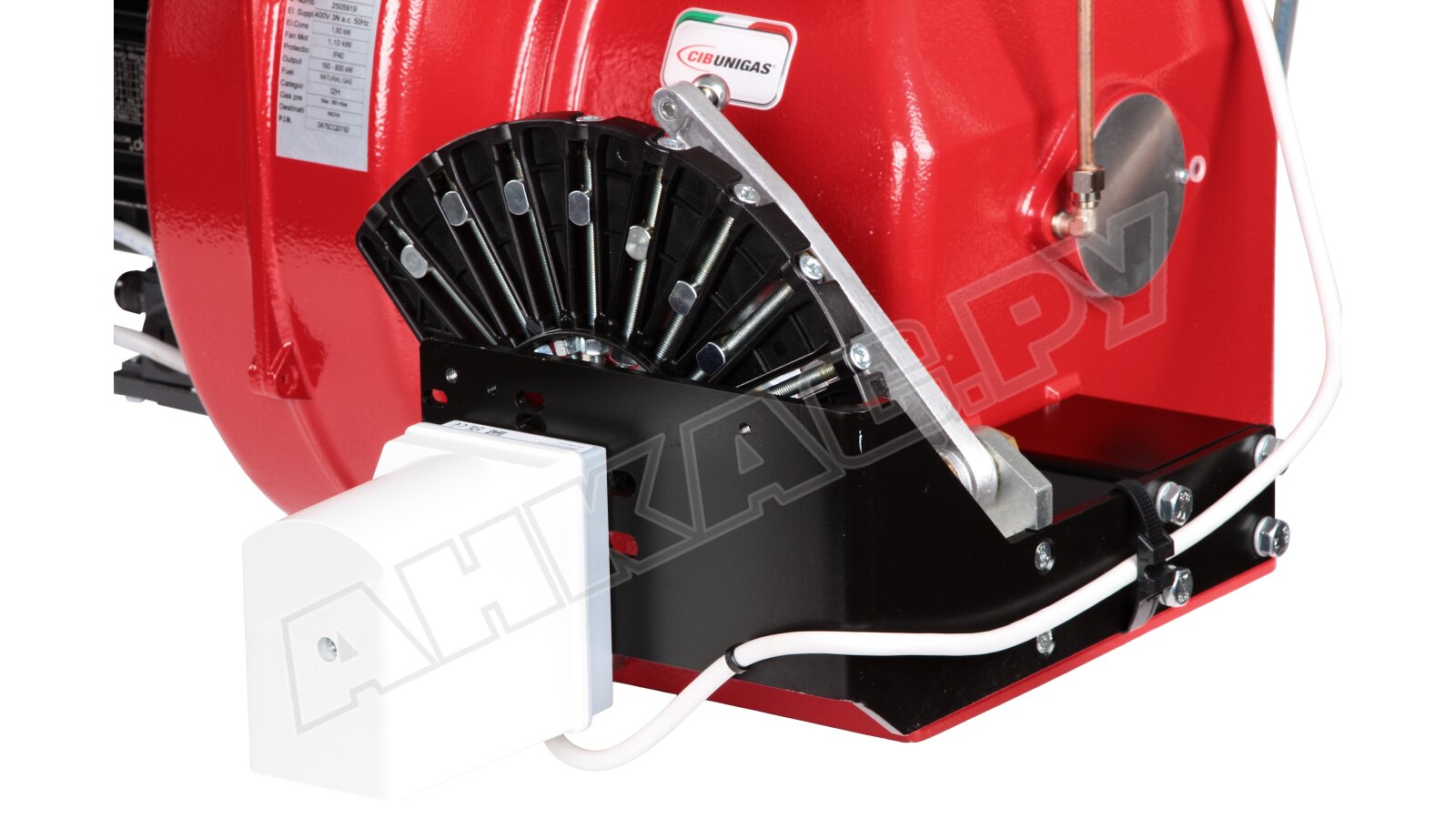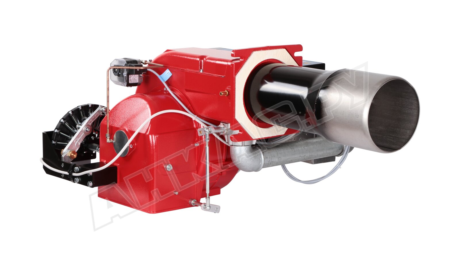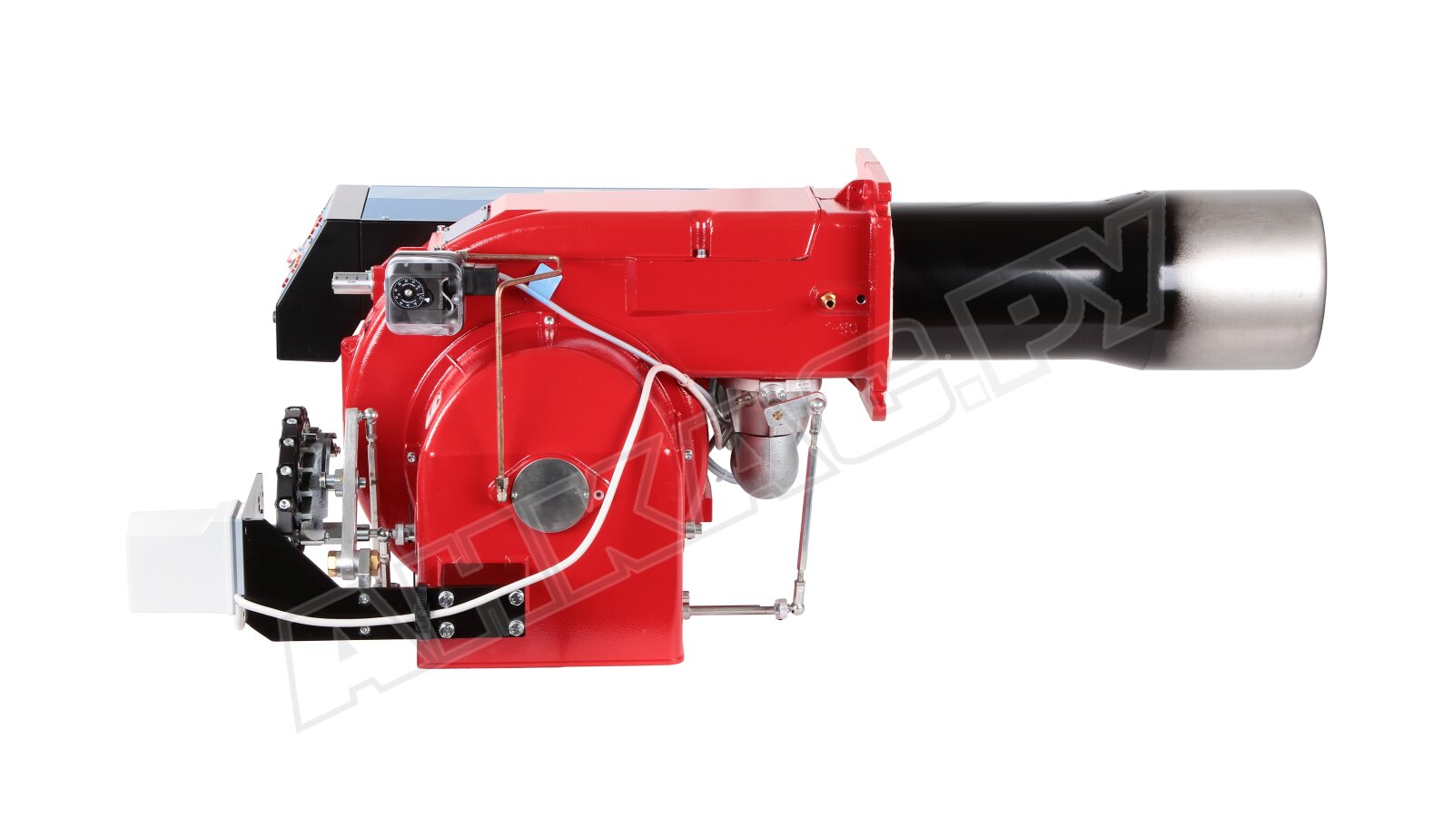 Модификация газовой горелки CIB Unigas, работающей на природном газе (метан), с прогрессивным регулированием, длинным соплом, с двумя клапанами и реле максимального давления газа. Поставляется в стандартном исполнении, диаметр газовой рампы Rp 2".