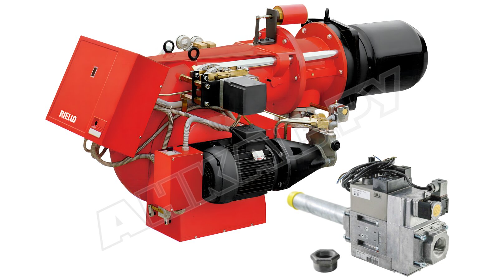 Газомазутная горелка Riello ENNE/EMME 1400 TC FS1 с газовой рампой Riello MB 415/1 CT RT 30, артикул 3970198. Газовая рампа с блоком контроля герметичности.