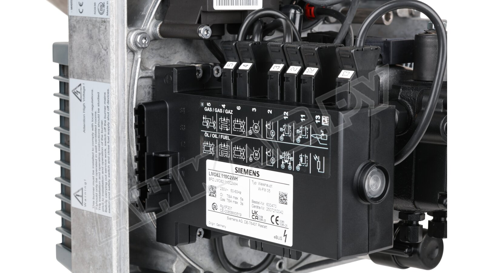 - На центральной панели размещена кнопка ручной разблокировки системы со встроенной сигнальной лампой. С помощью цветной индикации автоматика передает данные о текущей фазе работы и неполадках. Возможности менеджера горения позволяют подключать горелку к вышестоящей системе через шину eBUS.