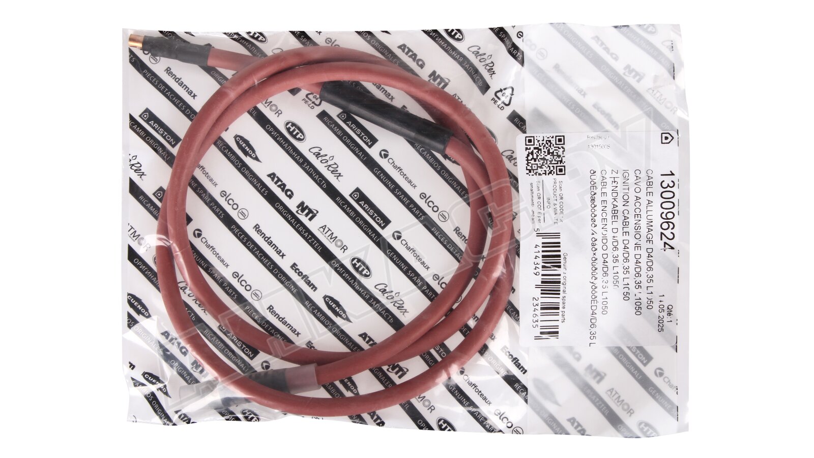 Для электроподключения узла розжига горелки используется кабель поджига 1050 мм, артикул: 13009624. Функцией кабеля является передача на поджигающий электрод высоковольтного напряжения для получения электрического разряда. В качестве изоляционного материала проводящий жилы используется силиконовый каучук Ø6 мм. Рабочая температура 250 °C. Штекеры Ø4 мм и 6,35 мм. Подсоединение к электроду розжига осуществляется с помощью штекерного разъема.