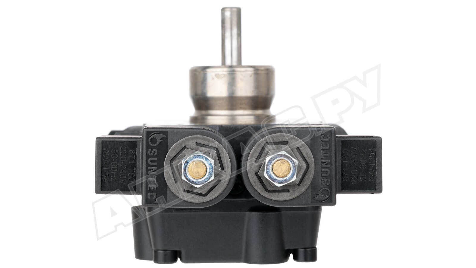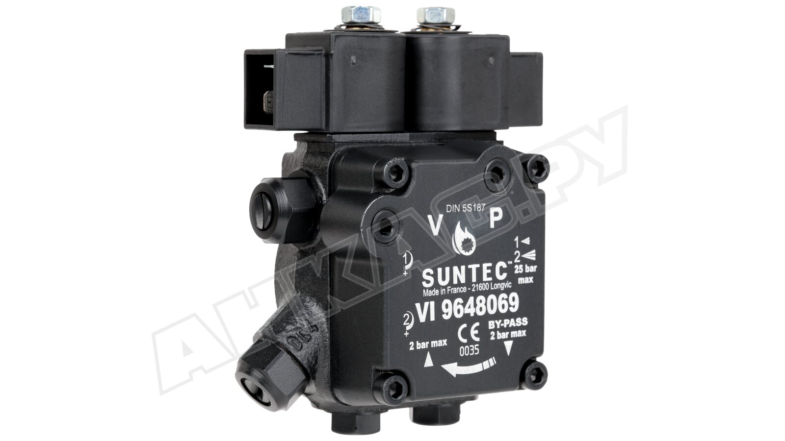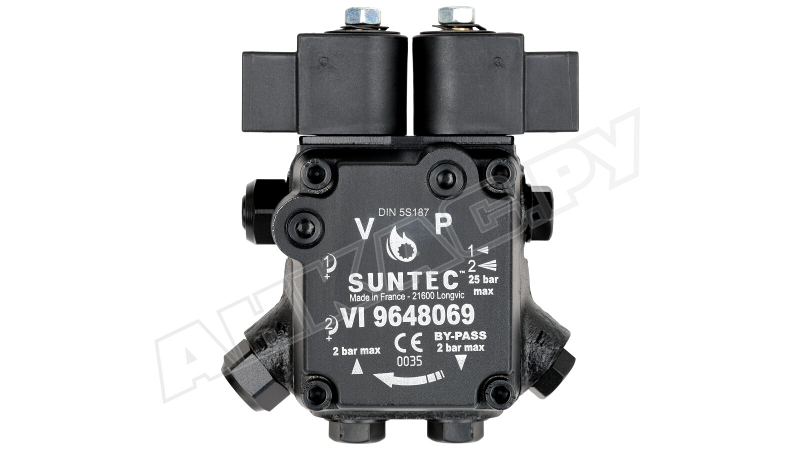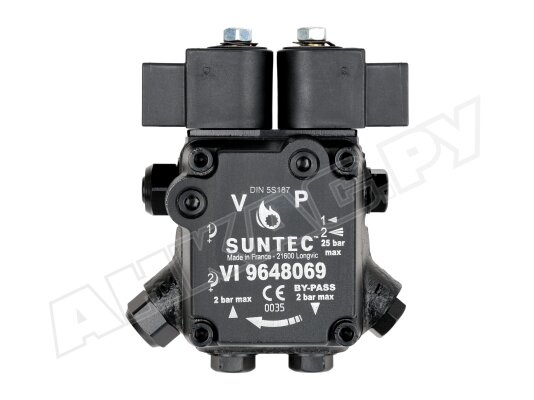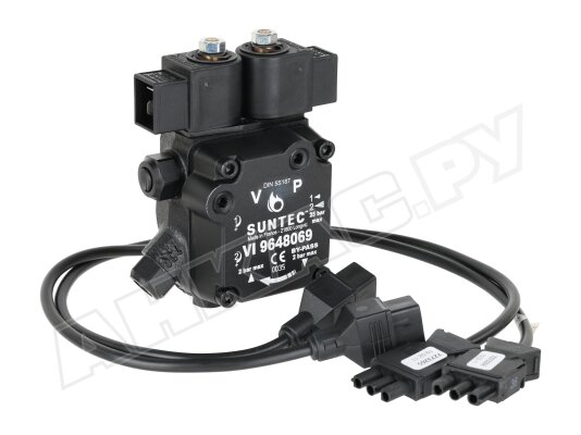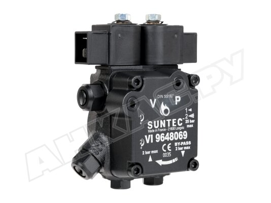 Насос серии AT2 оснащен э/м клапаном с отсекающей функцией (быстродействующий, нормально-закрытый, находится в линии форсунки) и двумя золотниковыми клапанами для каждой ступени давления. Переключение между режимами осуществляется с помощью нормально-открытого э/м клапана байпаса. Рабочей средой является дизельное топливо вязкостью 2-12 сСт. Насос может встраиваться в системы с одной или двумя трубами. Базовая сборка подготовлена к 2-трубному подключению. Предусмотрен один выход на форсунку. Насос рассчитан на работу с топливом температурой 0..+60 ºC. Устанавливается в промышленные жидкотопливные горелки мощностью до 1000 кВт.