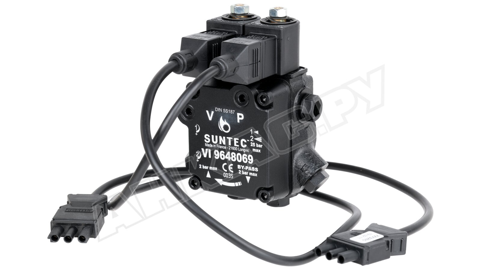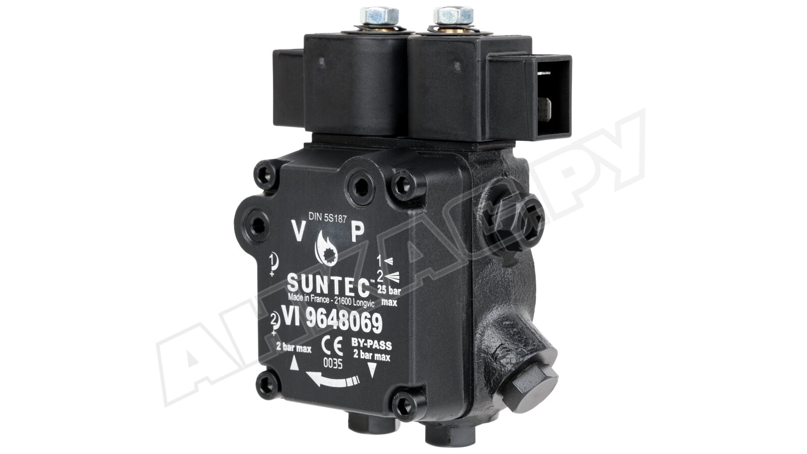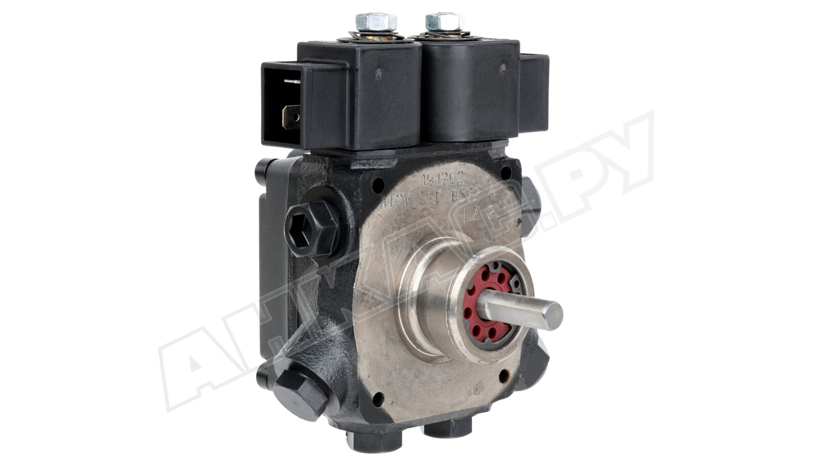 Насос серии AT2 оснащен э/м клапаном с отсекающей функцией (быстродействующий, нормально-закрытый, находится в линии форсунки) и двумя золотниковыми клапанами для каждой ступени давления. Переключение между режимами осуществляется с помощью нормально-открытого э/м клапана байпаса. Рабочей средой является дизельное топливо вязкостью 2-12 сСт. Насос может встраиваться в системы с одной или двумя трубами. Базовая сборка подготовлена к 2-трубному подключению. Предусмотрен один выход на форсунку. Насос рассчитан на работу с топливом температурой 0..+60 ºC. Устанавливается в промышленные жидкотопливные горелки мощностью до 1000 кВт.
