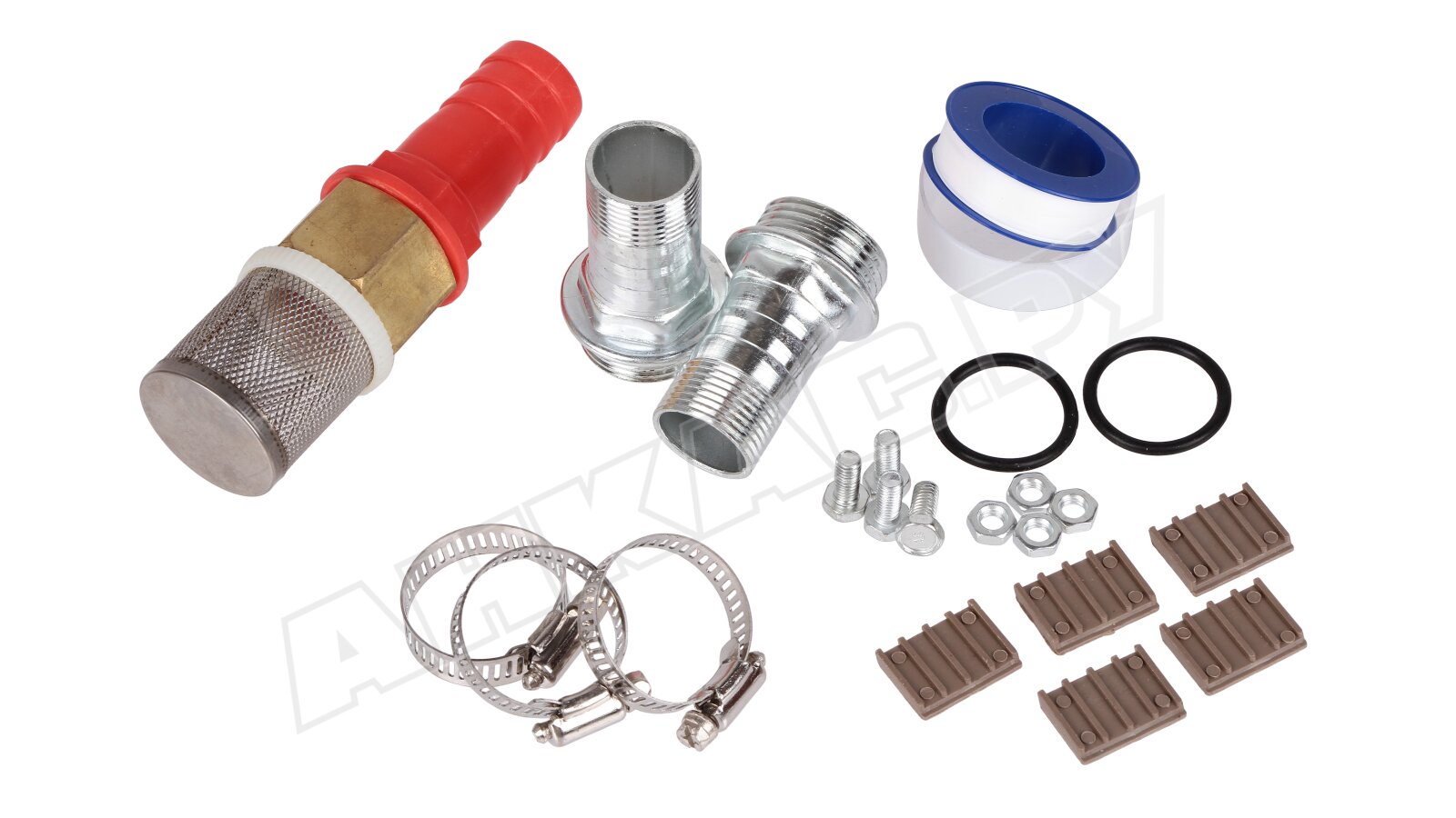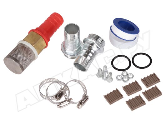 Входное и выходное отверстие — резьбовое, диаметр на входе — 1,5 дюйма (38 мм), на выходе — 1 дюйм (25 мм). Штуцеры для соединения с рукавами — в комплекте.